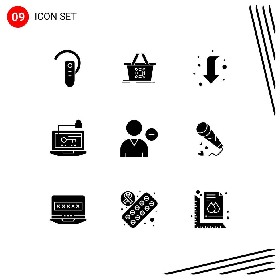 Editable Vector Line Pack of 9 Simple Solid Glyphs of laptop hardware shopping computer left Editable Vector Design Elements Free Vector