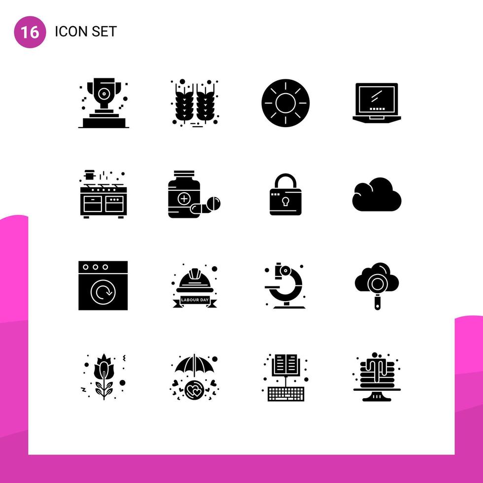 Editable Vector Line Pack of 16 Simple Solid Glyphs of cooker imac fruits device computer Editable Vector Design Elements