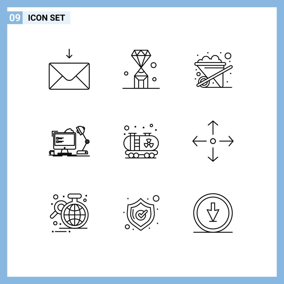 Mobile Interface Outline Set of 9 Pictograms of pollution computer construction lamp workstation Editable Vector Design Elements
