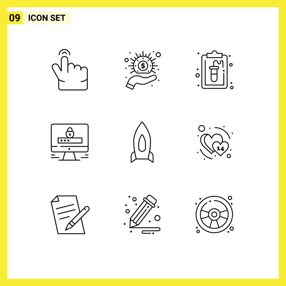 Pack of 9 Modern Outlines Signs and Symbols for Web Print Media such as speedup rocket document security internet Editable Vector Design Elements