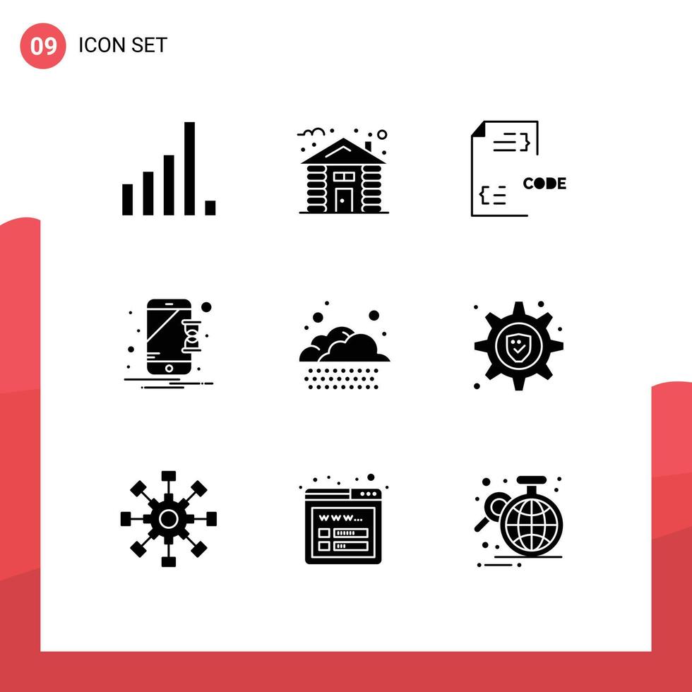 Group of 9 Solid Glyphs Signs and Symbols for rain notification coding mobile device Editable Vector Design Elements