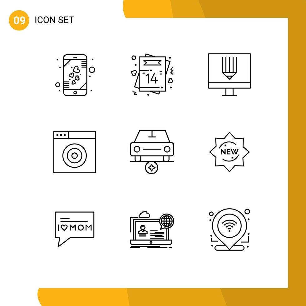 Mobile Interface Outline Set of 9 Pictograms of car internet romantic find development Editable Vector Design Elements