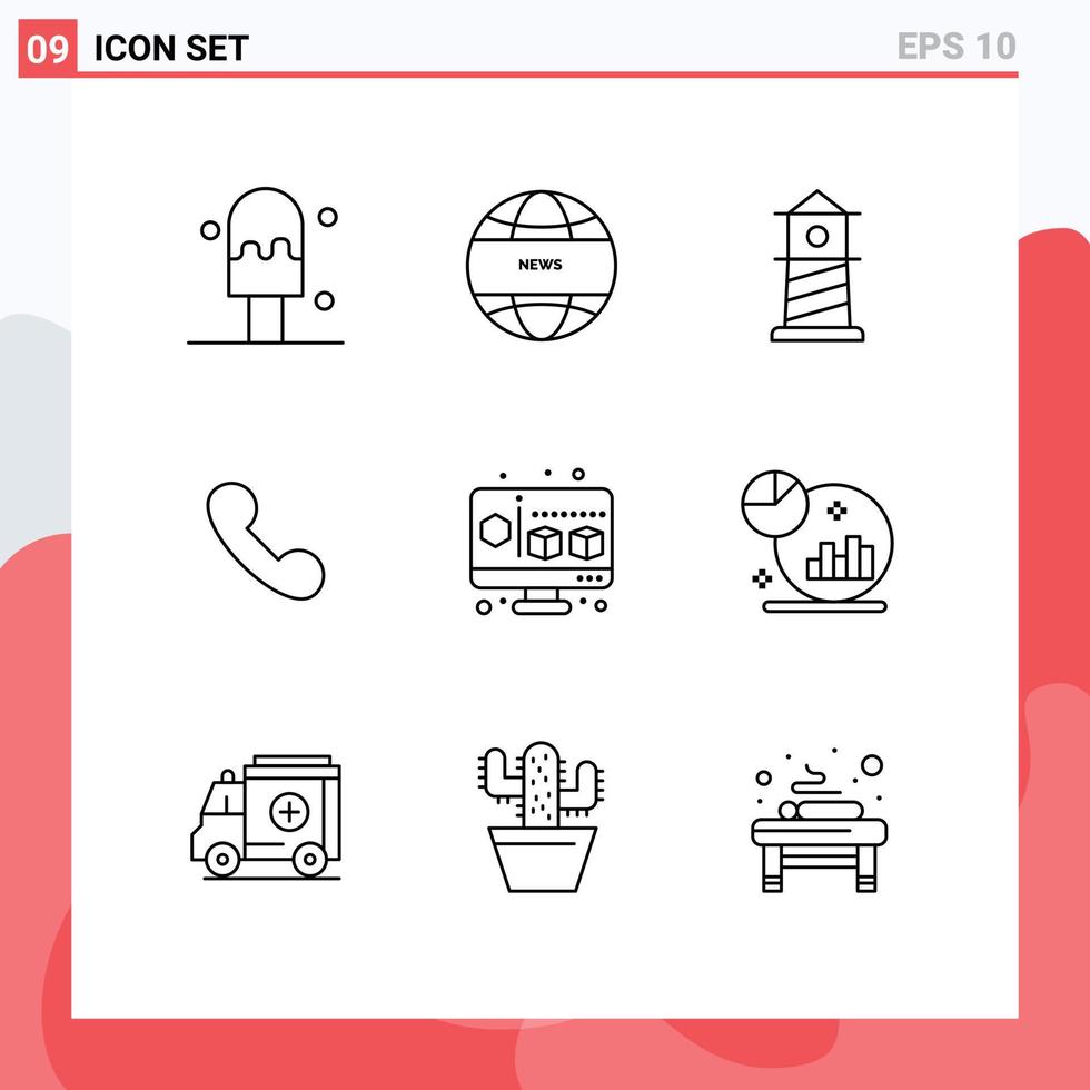 Pack of 9 Modern Outlines Signs and Symbols for Web Print Media such as grown analysis phone computer cube Editable Vector Design Elements