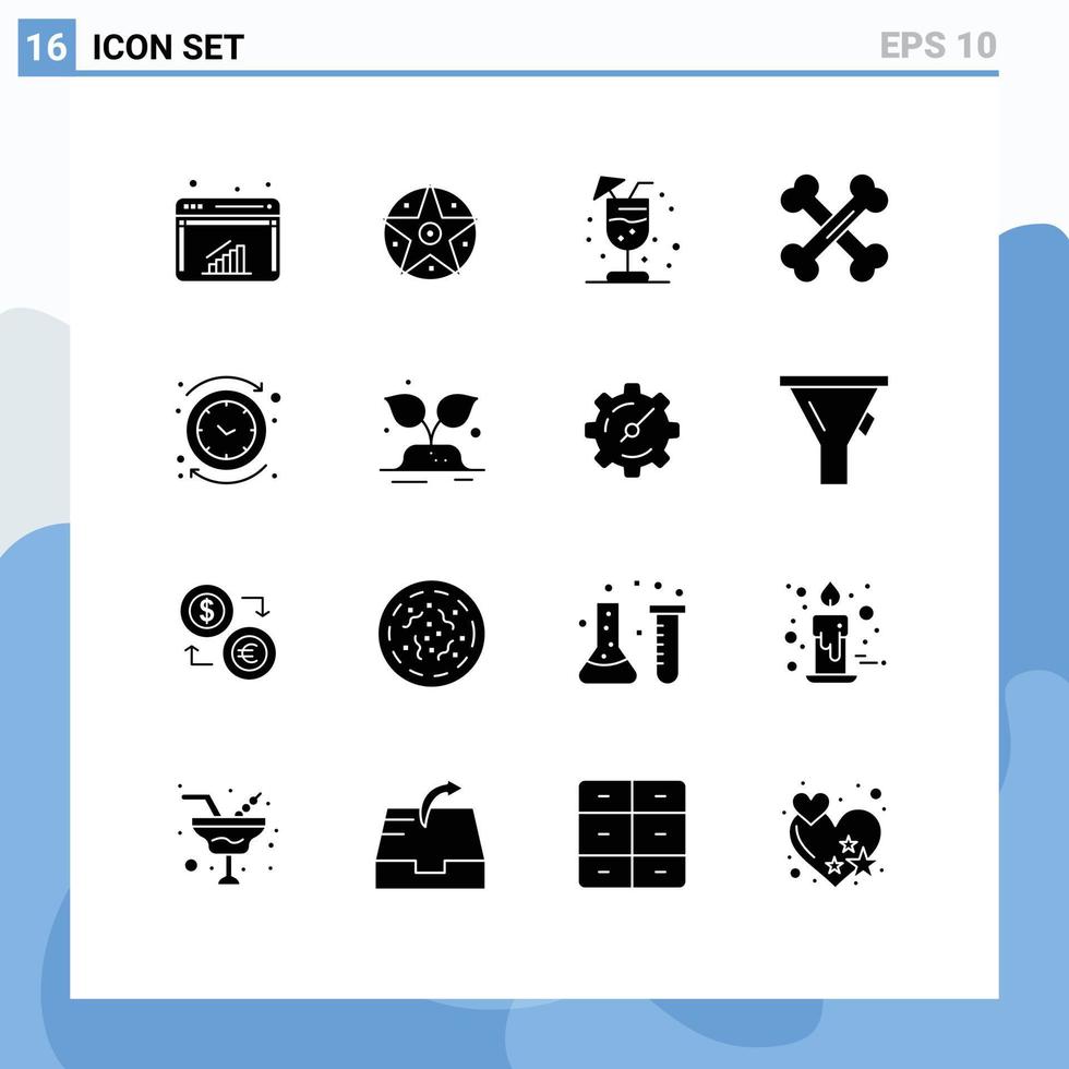 Set of 16 Vector Solid Glyphs on Grid for clock backward drink science bones Editable Vector Design Elements