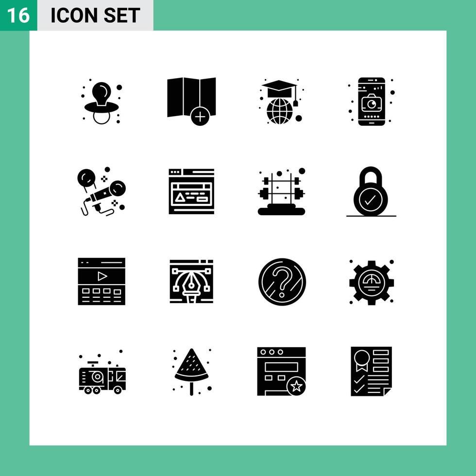 Editable Vector Line Pack of 16 Simple Solid Glyphs of web singing globe party karaoke Editable Vector Design Elements Free Vector