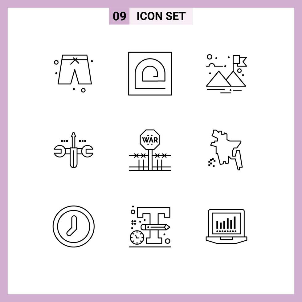 Mobile Interface Outline Set of 9 Pictograms of military combat finish toolings computing Editable Vector Design Elements