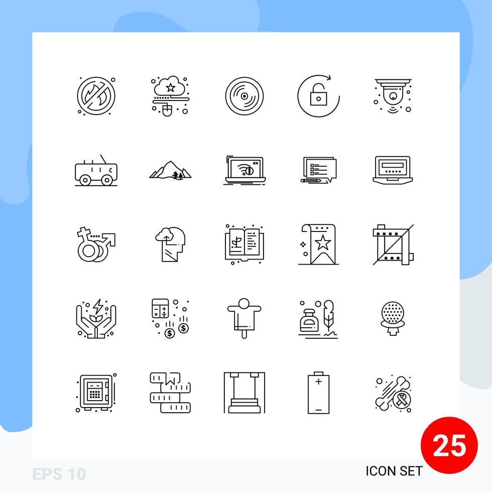 25 Universal Lines Set for Web and Mobile Applications closed cctv cd unlock arrow Editable Vector Design Elements