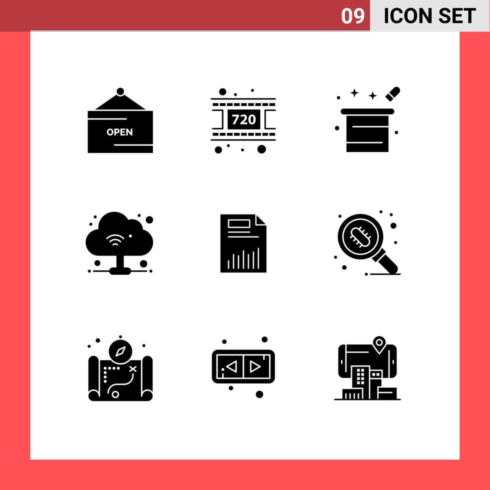 Set of 9 Vector Solid Glyphs on Grid for chart document magic hat wifi cloud Editable Vector Design Elements
