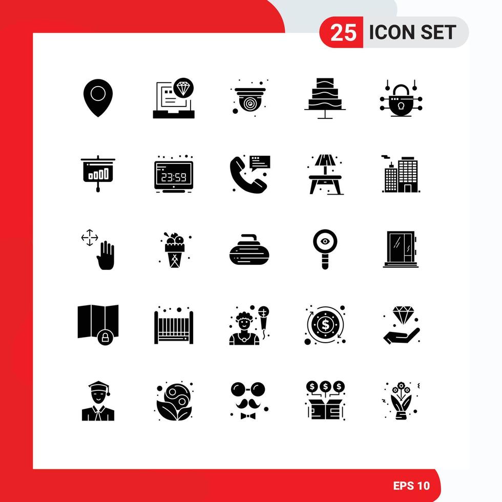 Pack of 25 Modern Solid Glyphs Signs and Symbols for Web Print Media such as network security internet cam photo editor Editable Vector Design Elements Free Vector