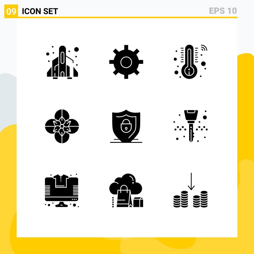 Pictogram Set of 9 Simple Solid Glyphs of security shield temperature internet flower Editable Vector Design Elements