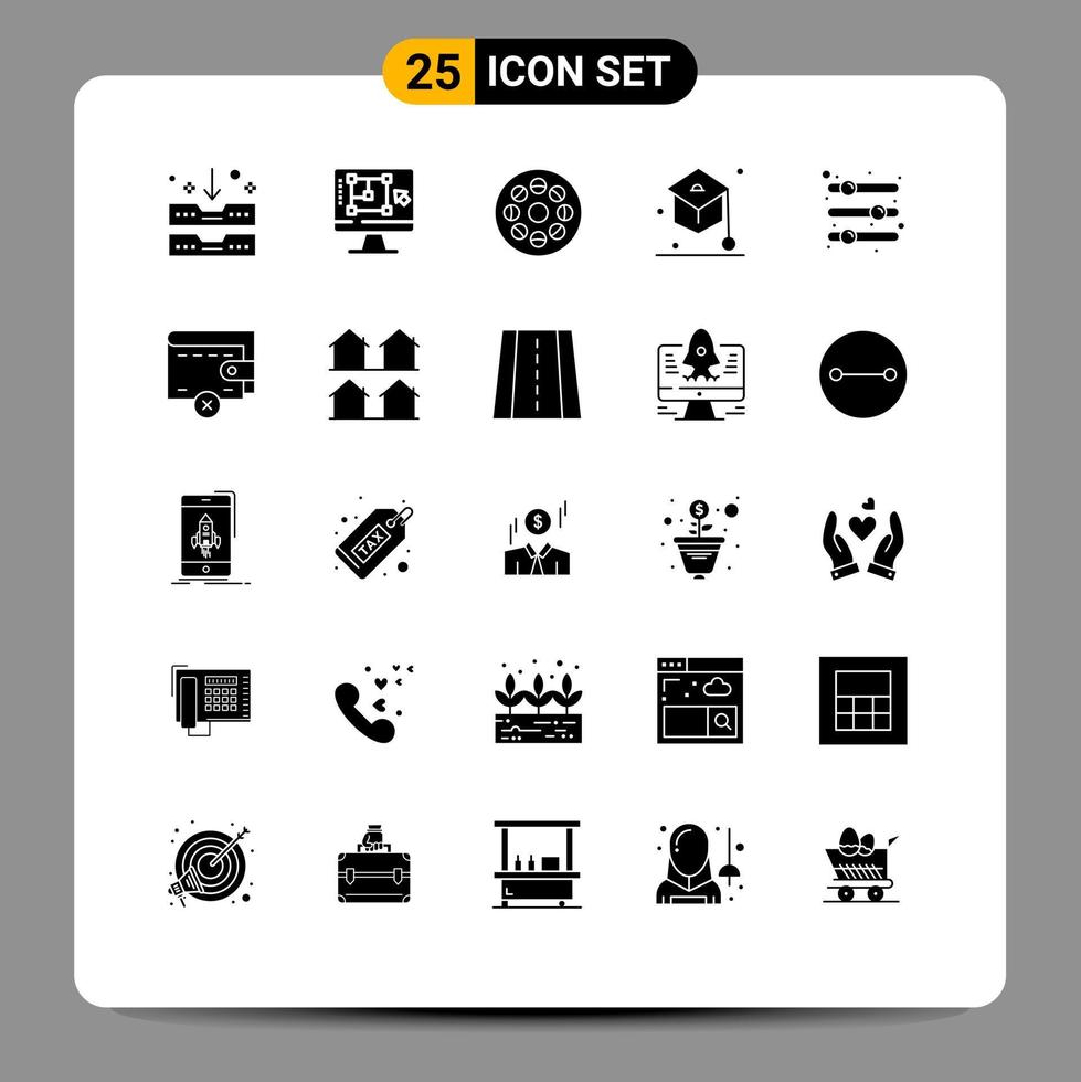 25 Universal Solid Glyphs Set for Web and Mobile Applications configuration school increase graduation video Editable Vector Design Elements
