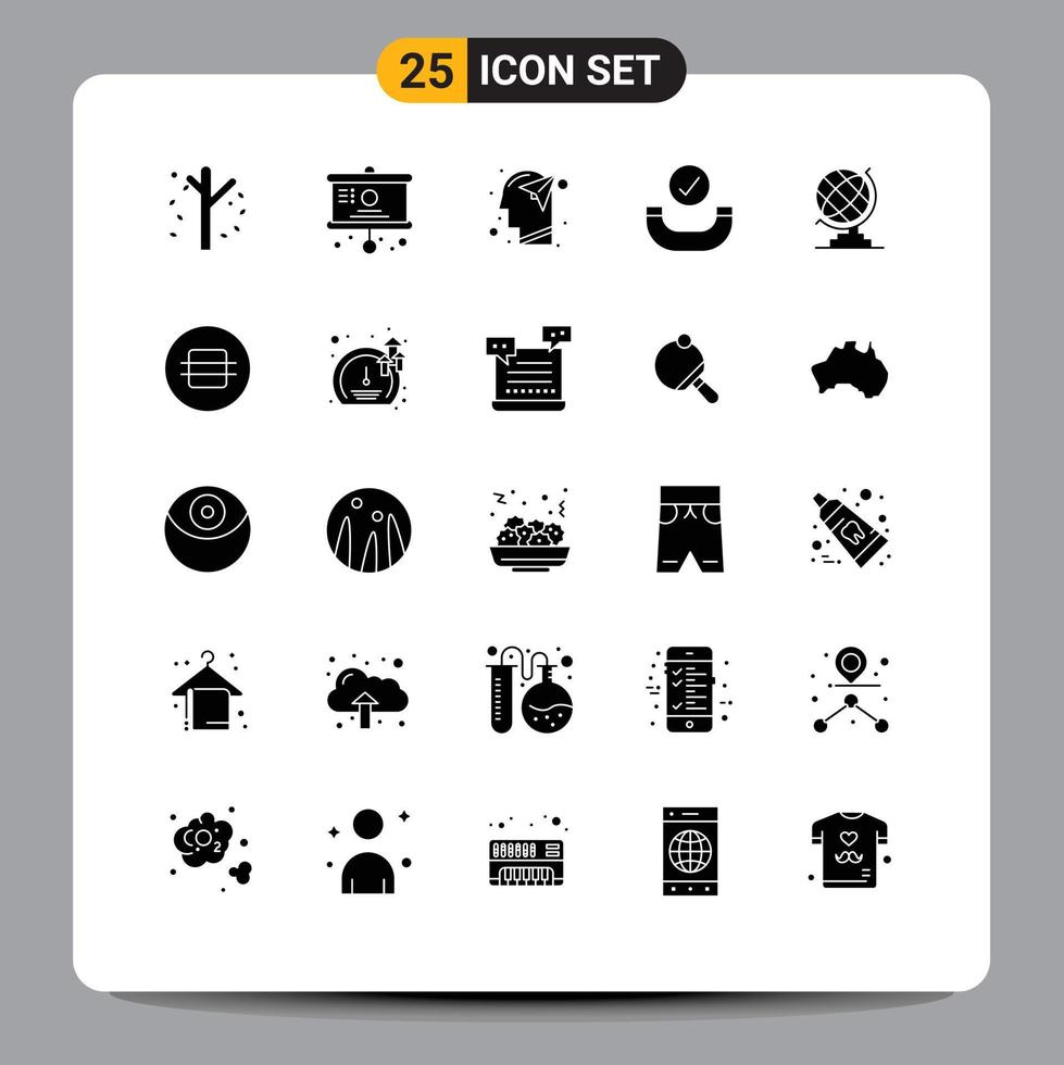 25 Universal Solid Glyphs Set for Web and Mobile Applications earth checked presentation call mind Editable Vector Design Elements