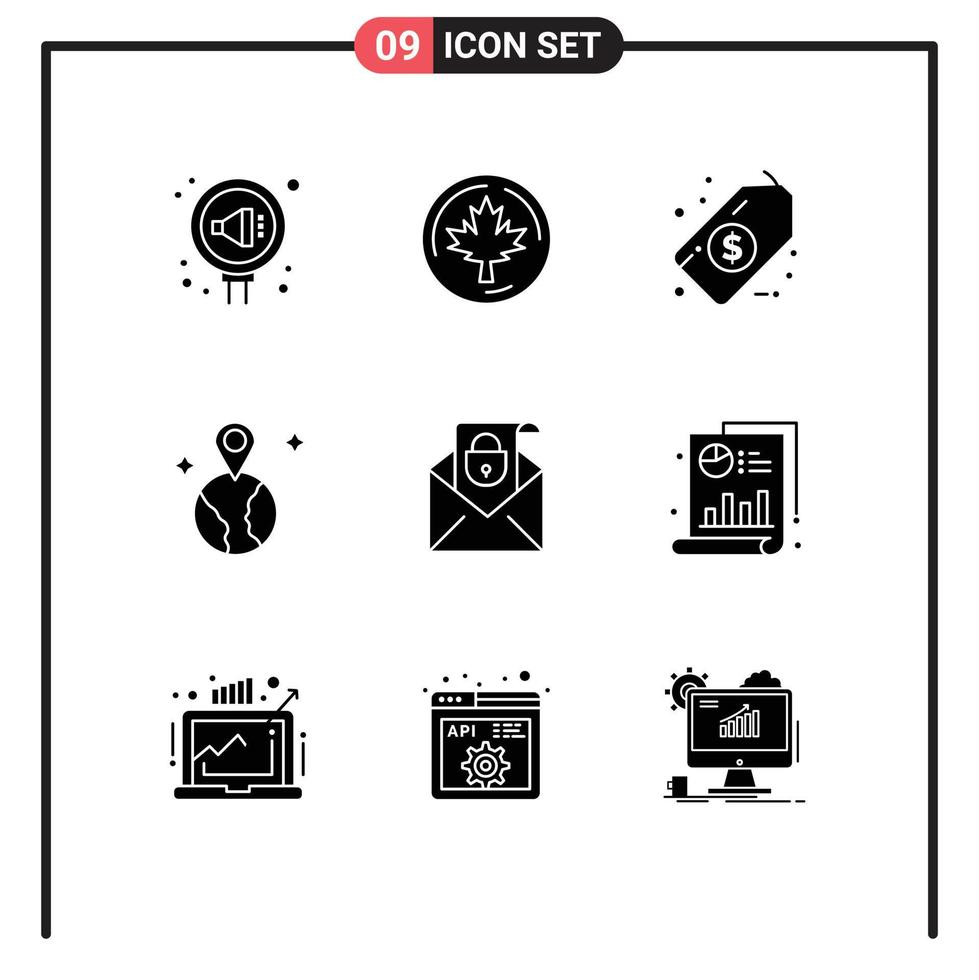 Pack of 9 Modern Solid Glyphs Signs and Symbols for Web Print Media such as message mail maple location world Editable Vector Design Elements