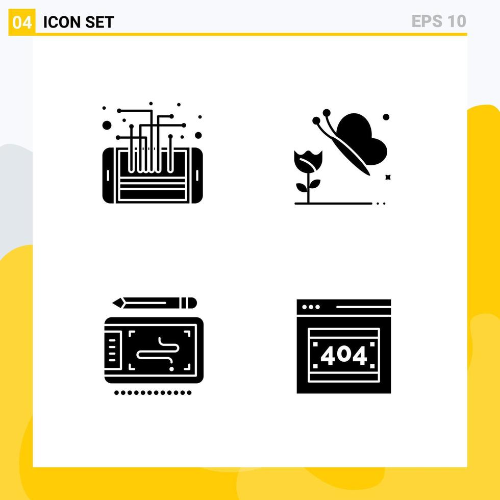 Mobile Interface Solid Glyph Set of 4 Pictograms of circuit graphic processor flower wacom Editable Vector Design Elements