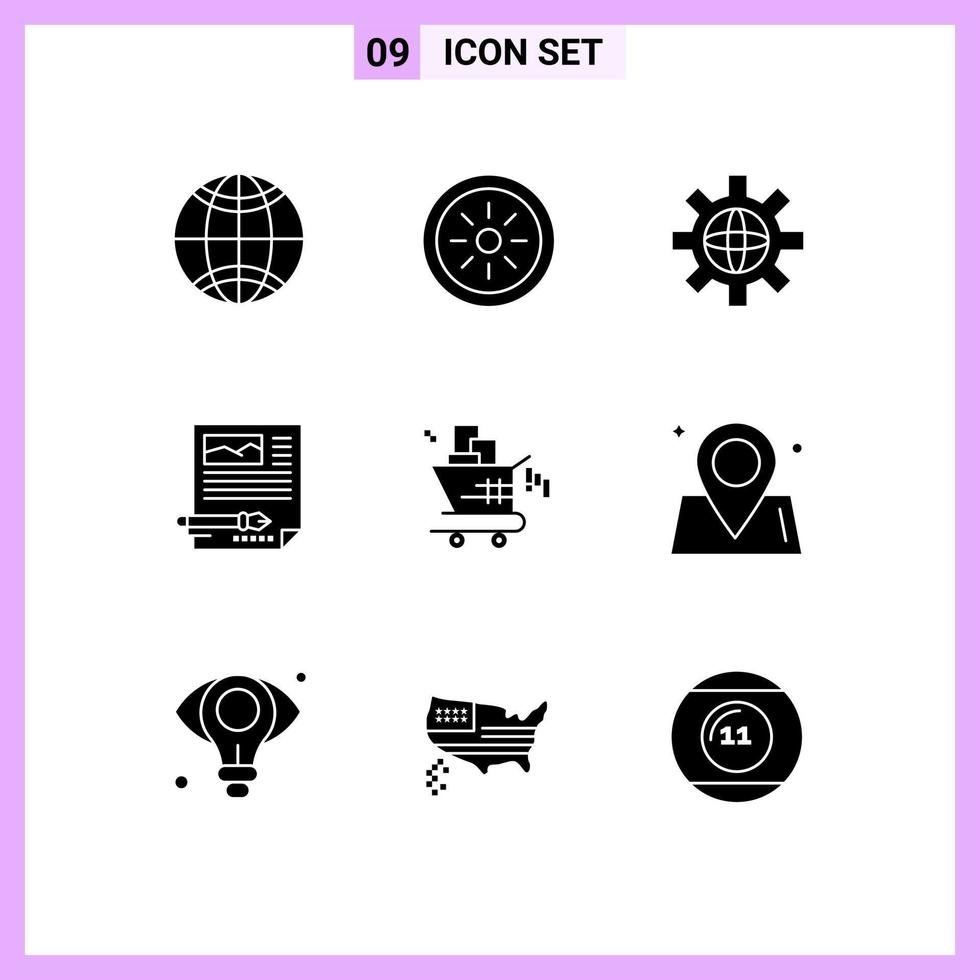 9 Universal Solid Glyphs Set for Web and Mobile Applications seo cart setting pen paper Editable Vector Design Elements