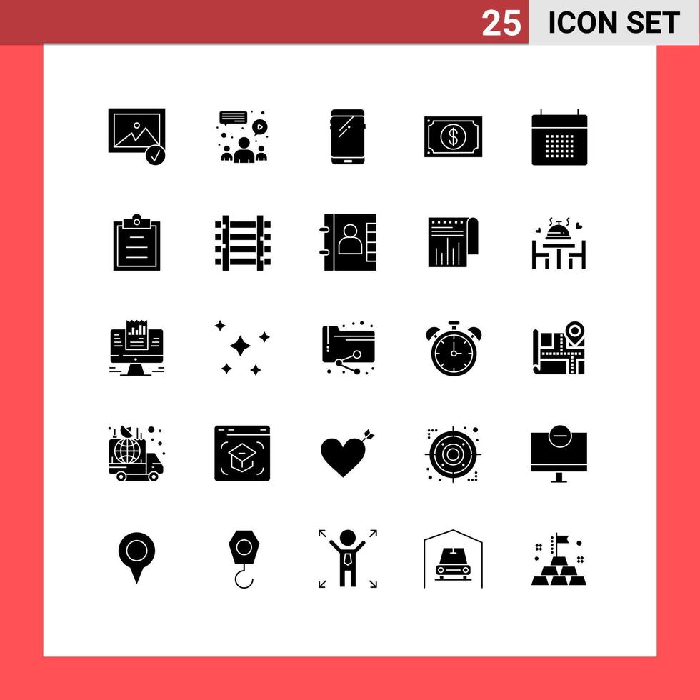 25 Universal Solid Glyphs Set for Web and Mobile Applications appointment watch smart phone payment currency Editable Vector Design Elements