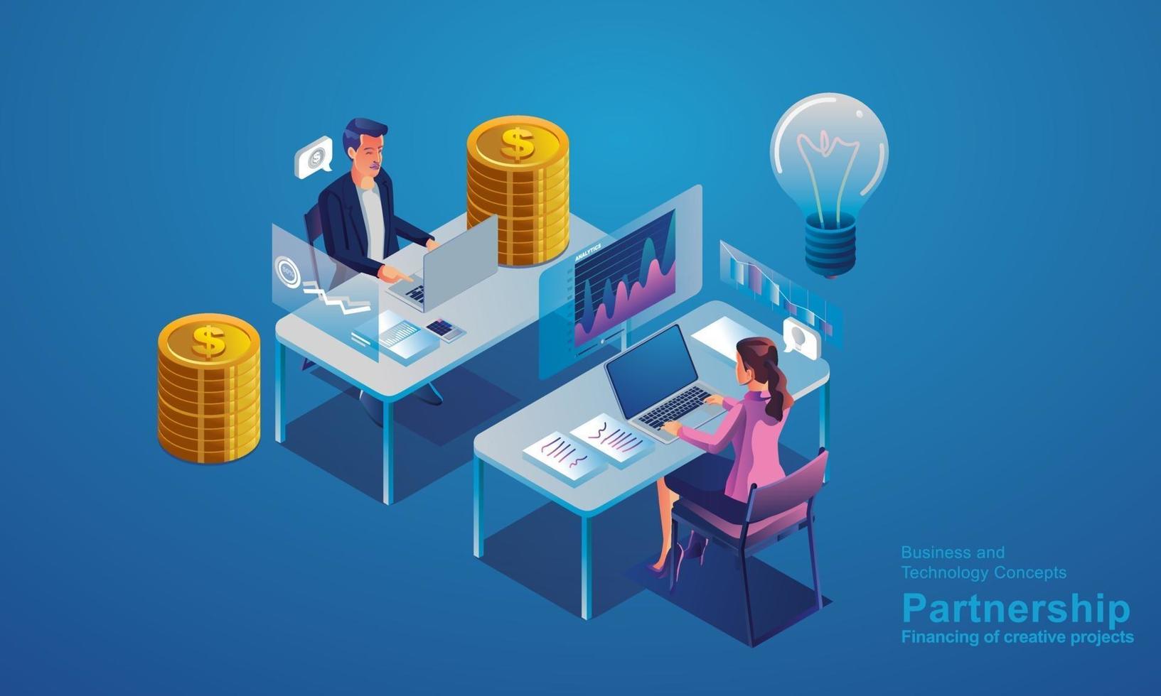 Data Analysis and Statistics concept. business analytics, Data visualization. Technology, Isometric Investors, and creative providers sit and discuss Providing customer, Flat vector illustration Pro Vector