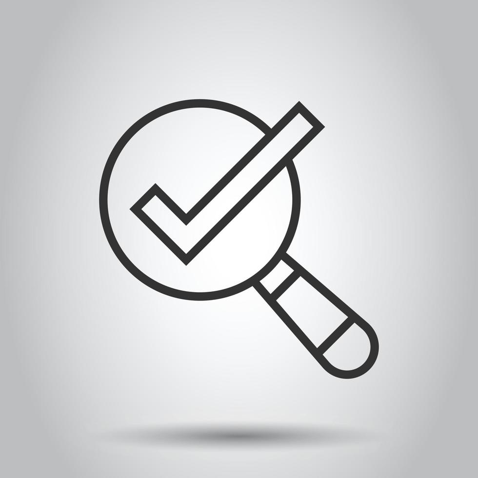 Check mark with magnifying glass icon in flat style. Loupe accept vector illustration on white isolated background. Search checklist business concept. Pro Vector