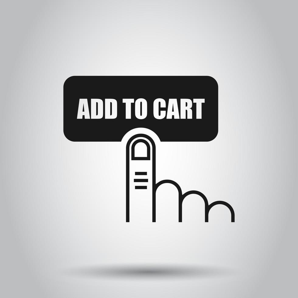 Add to cart shop icon in flat style. Finger cursor vector illustration on isolated background. Click button business concept. Pro Vector