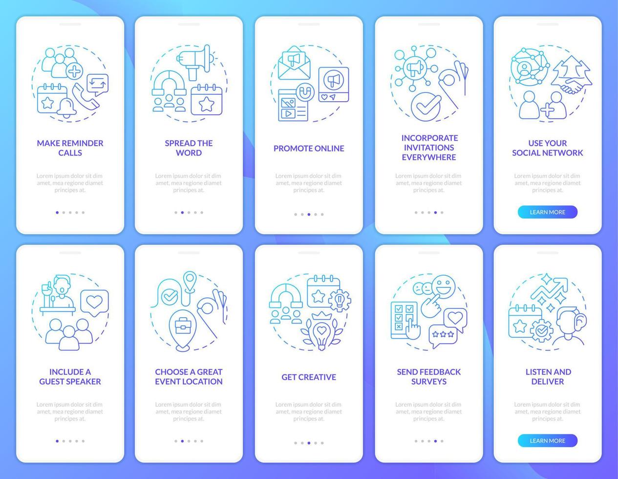 Increasing meeting attendance blue gradient onboarding mobile app screen set. Walkthrough 5 steps graphic instructions with linear concepts. UI, UX, GUI template Pro Vector