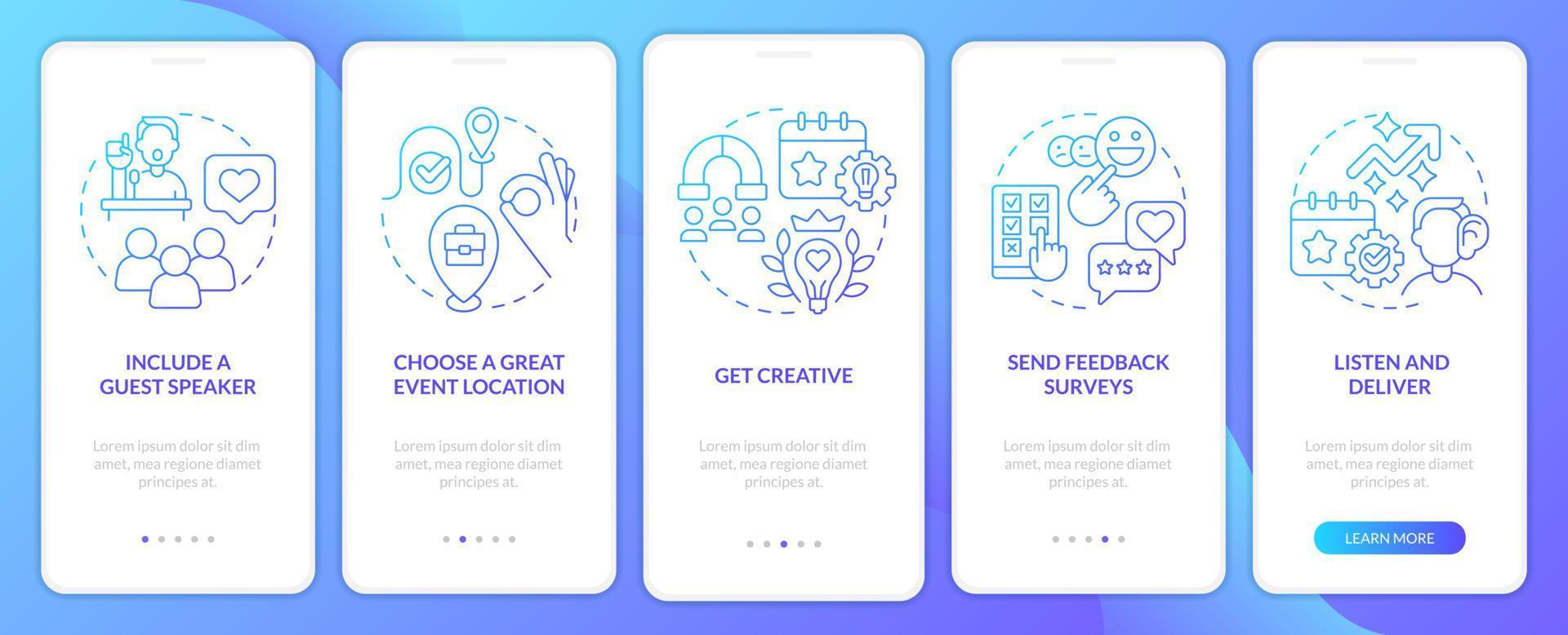 Increasing events attendance blue gradient onboarding mobile app screen. Walkthrough 5 steps graphic instructions with linear concepts. UI, UX, GUI template Pro Vector
