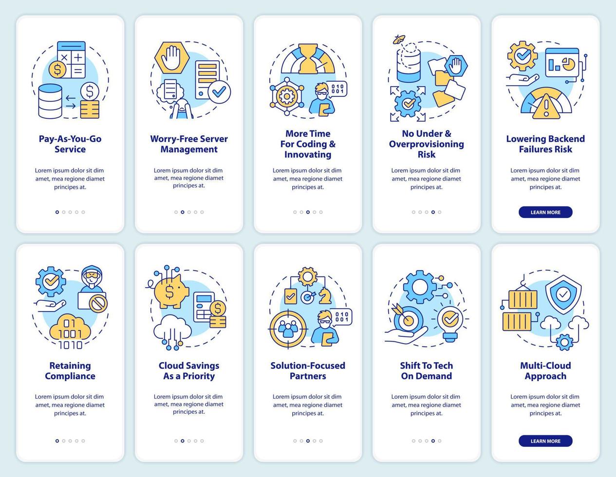Cloud computing trends onboarding mobile app screen set. IT walkthrough 5 steps editable graphic instructions with linear concepts. UI, UX, GUI template Pro Vector