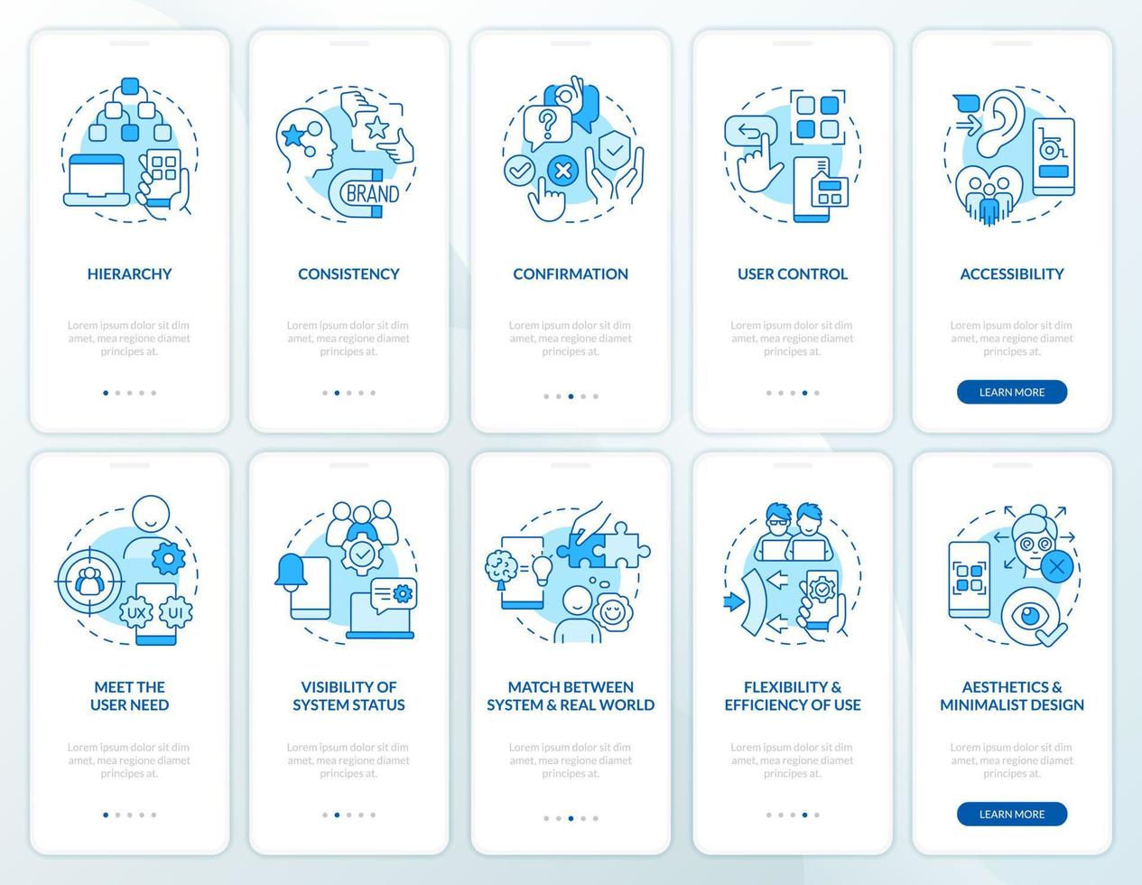User experience design rules blue onboarding mobile app screen set. Walkthrough 5 steps editable graphic instructions with linear concepts. UI, UX, GUI template Pro Vector and Pro SVG