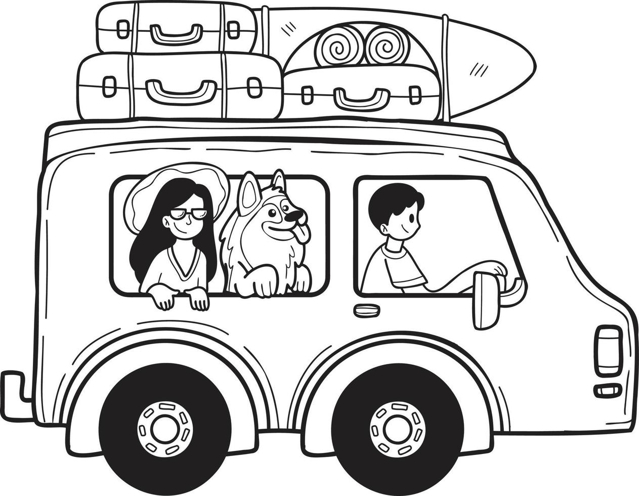 Hand Drawn Road trip van illustration in doodle style Pro Vector