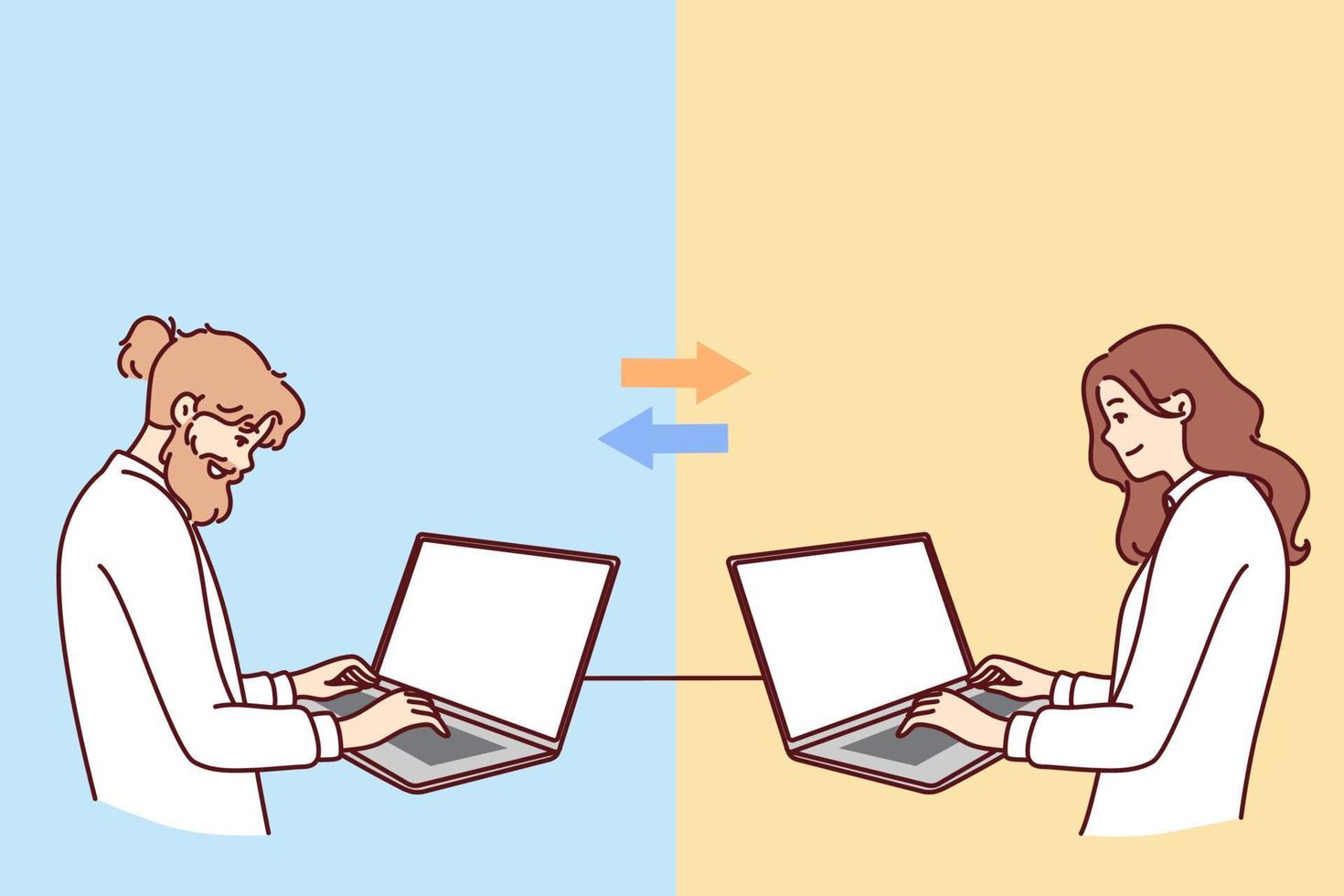 Teamwork of man and woman working remotely via laptops on project and exchanging information via internet. Concept teamwork and simultaneous change of one document by different people Pro Vector
