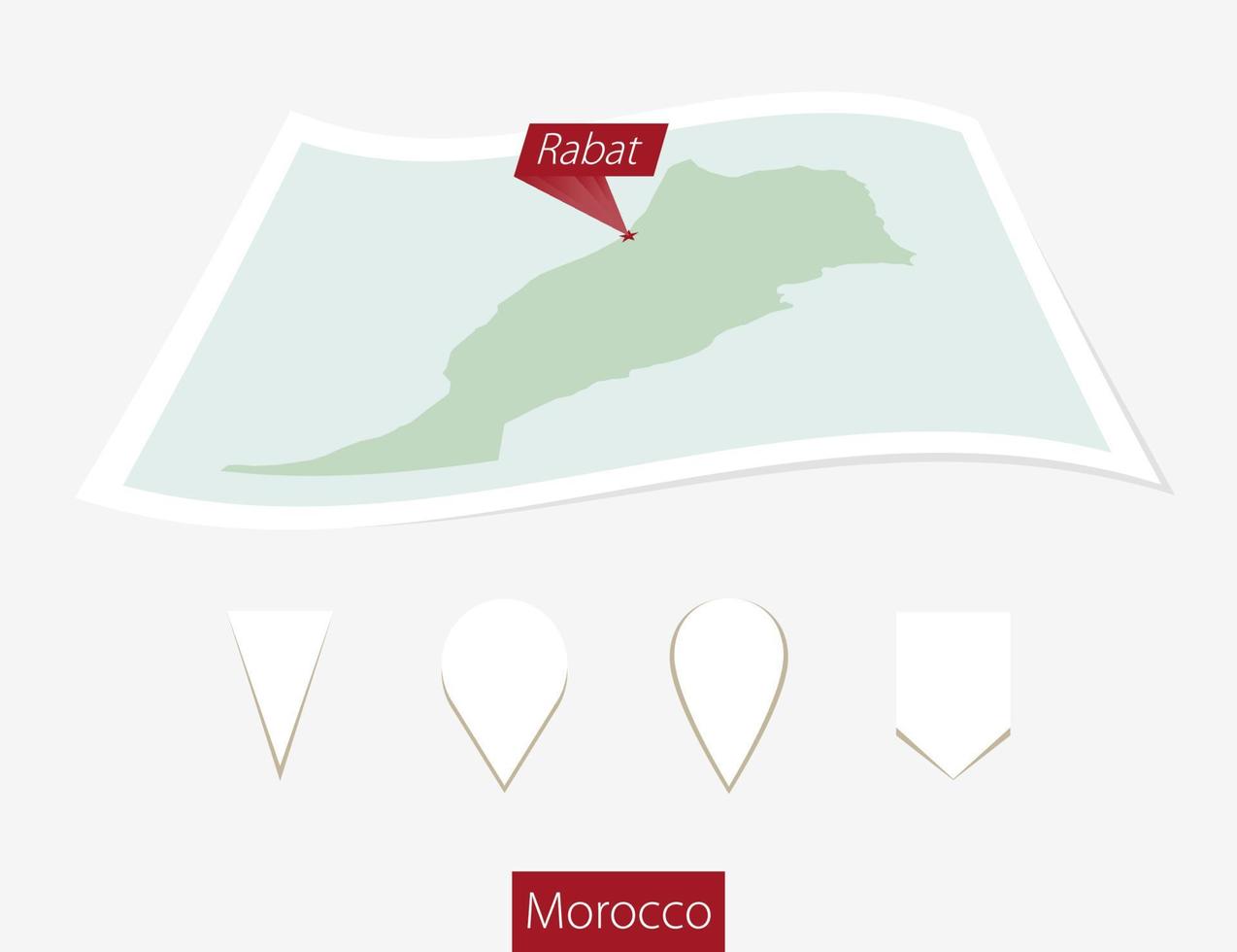 Curved paper map of Morocco with capital Rabat on Gray Background. Four different Map pin set. Pro Vector and Pro SVG