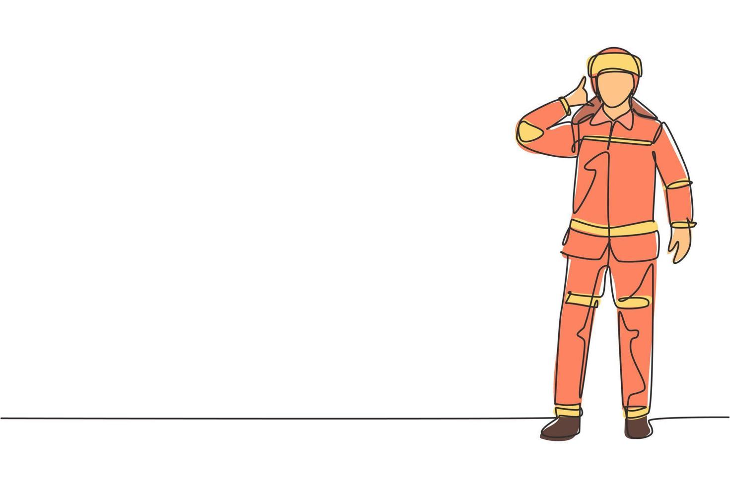 Continuous one line drawing firefighters stood with call me gesture, wearing helmets and complete uniforms work to extinguish fire at building. Single line draw design vector graphic illustration Pro Vector