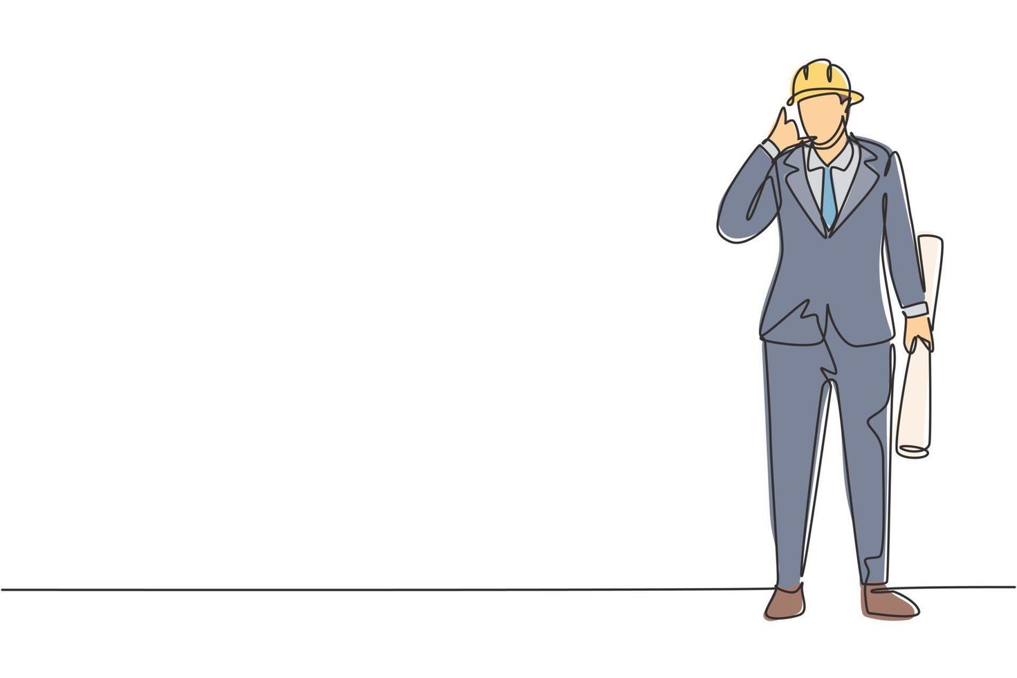 Single one line drawing architect stood with call me gesture and wearing helmet carrying blueprint for the building's work plan. Successful job. Continuous line draw design graphic vector illustration Pro Vector