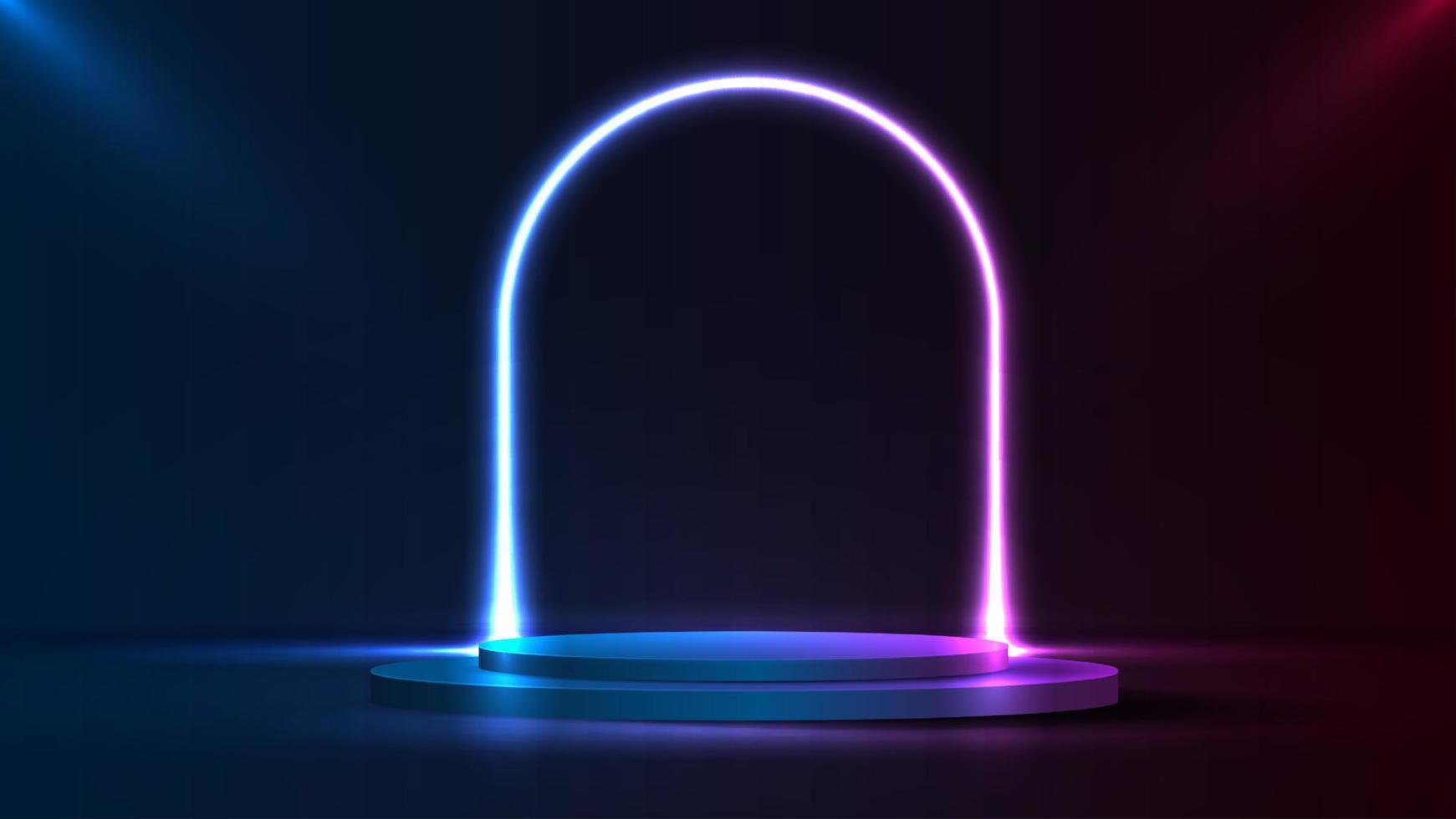 Podium or stand with line gradient neon in Sci-fi. abstract scene with pink and blue neon frame. vector rendering product display. futuristic minimal scene. vector design. Pro Vector