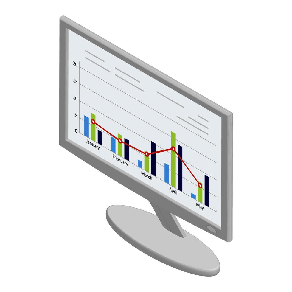 Isometric monitor with graphs and charts on the screen isolated on white. Vector EPS10. Pro Vector