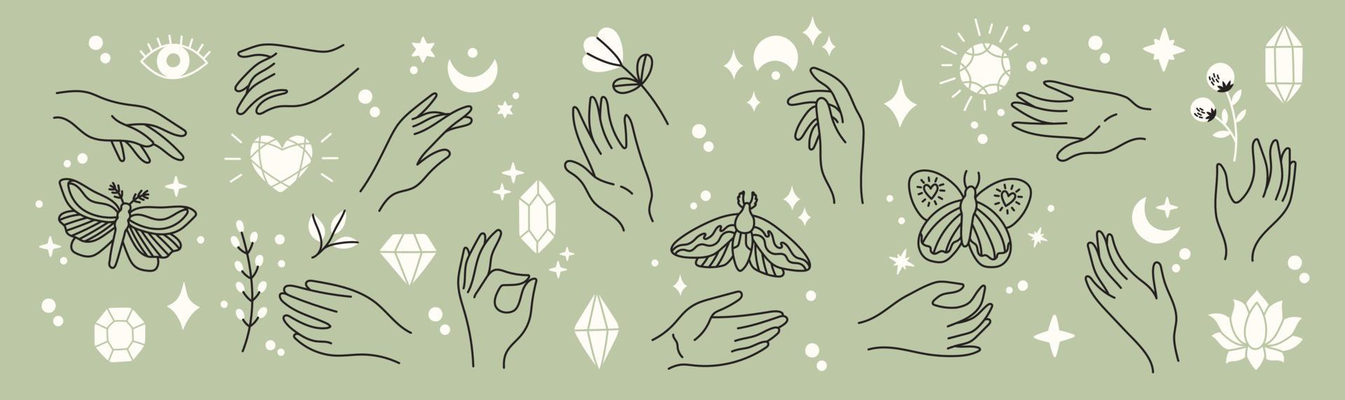 Mystical and esoteric vector set in trendy minimal lineart style. Vector in boho style hands and mystical objects Pro Vector