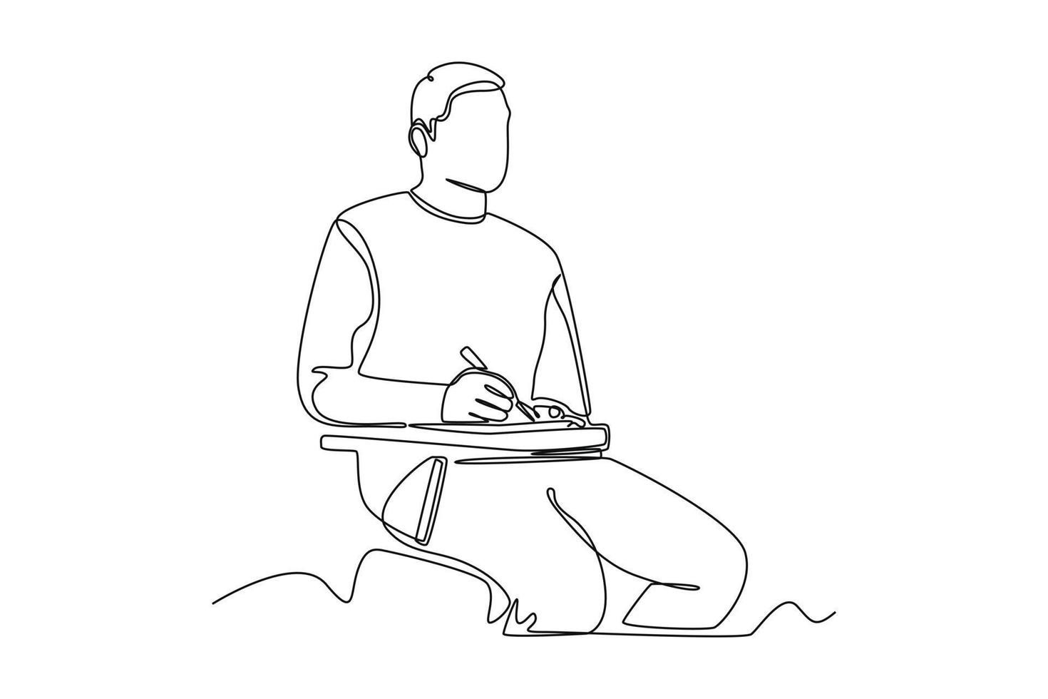 Continuous one line drawing male students are focusing on taking notes in class. Class in action concept. Single line draw design vector graphic illustration. Pro Vector