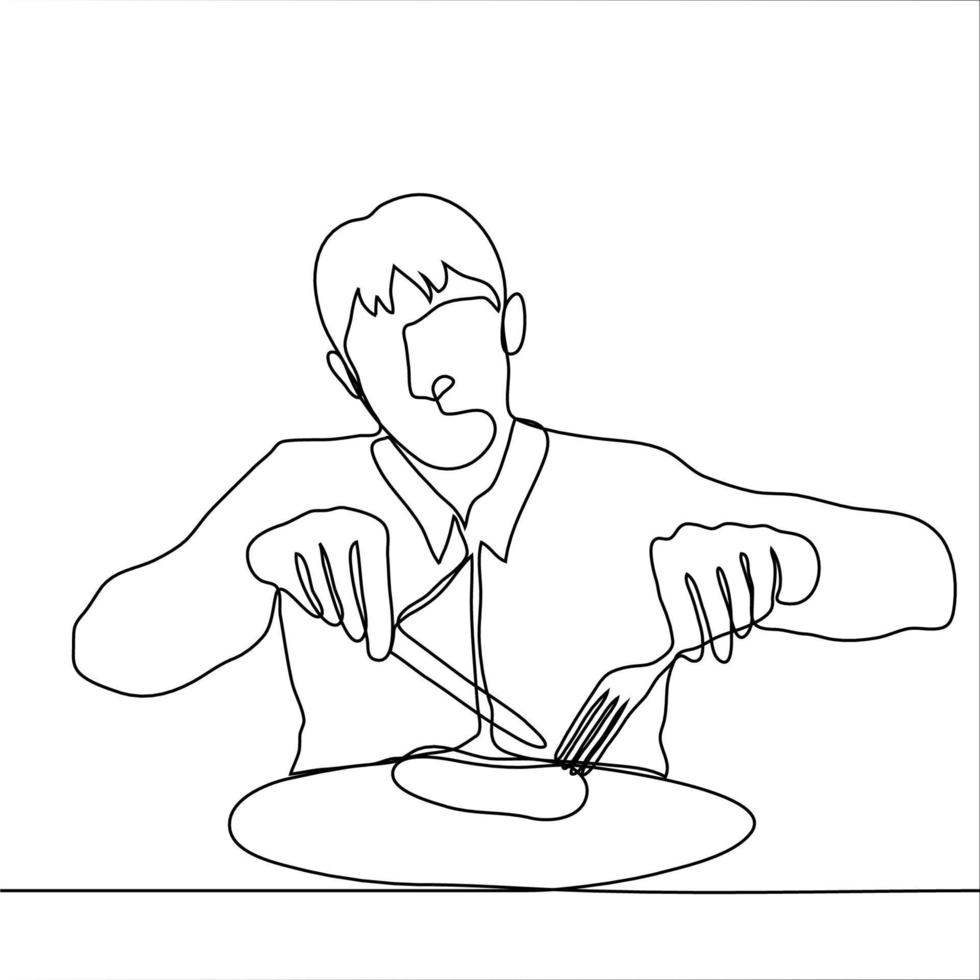 man cuts a steak. one line drawing a man in a shirt sits at a large plate on which a chop, he cuts it with a fork and knife. Concept of a man in a restaurant eating meat Pro Vector and Pro SVG