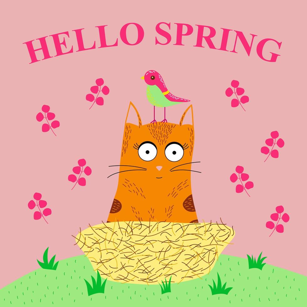 Card Hello Spring with a Cat in a Nest and a Bird Pro Vector