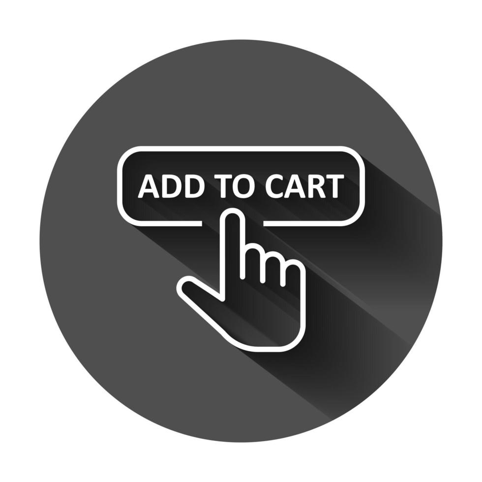 Add to cart shop icon in flat style. Finger cursor vector illustration on black round background with long shadow. Click button business concept. Pro Vector