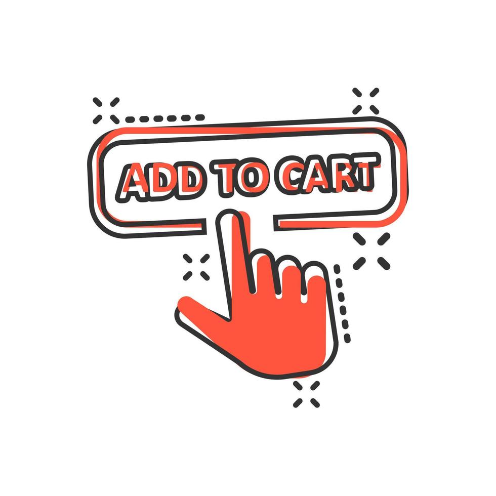 Add to cart shop icon in comic style. Finger cursor vector cartoon illustration on white isolated background. Click button business concept splash effect. Pro Vector