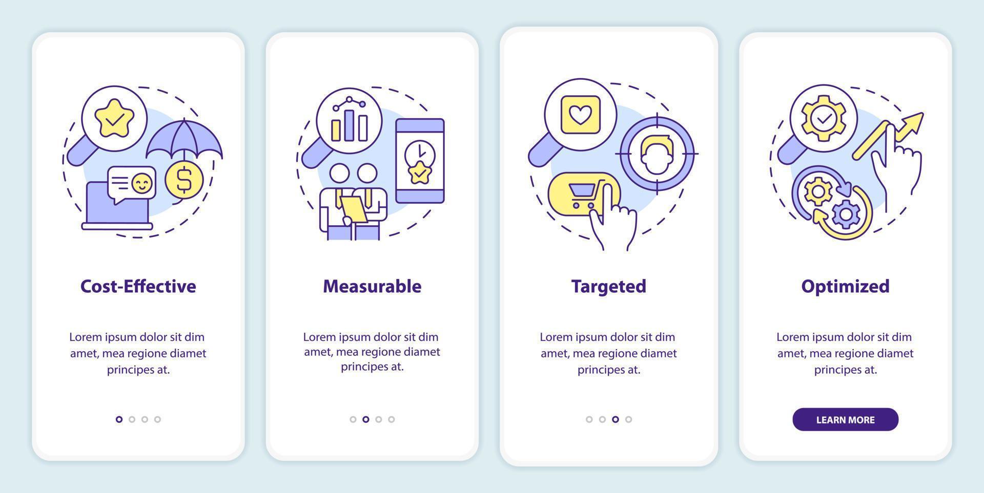 Digital advertising benefits onboarding mobile app screen. Promotion walkthrough 4 steps editable graphic instructions with linear concepts. UI, UX, GUI template Pro Vector