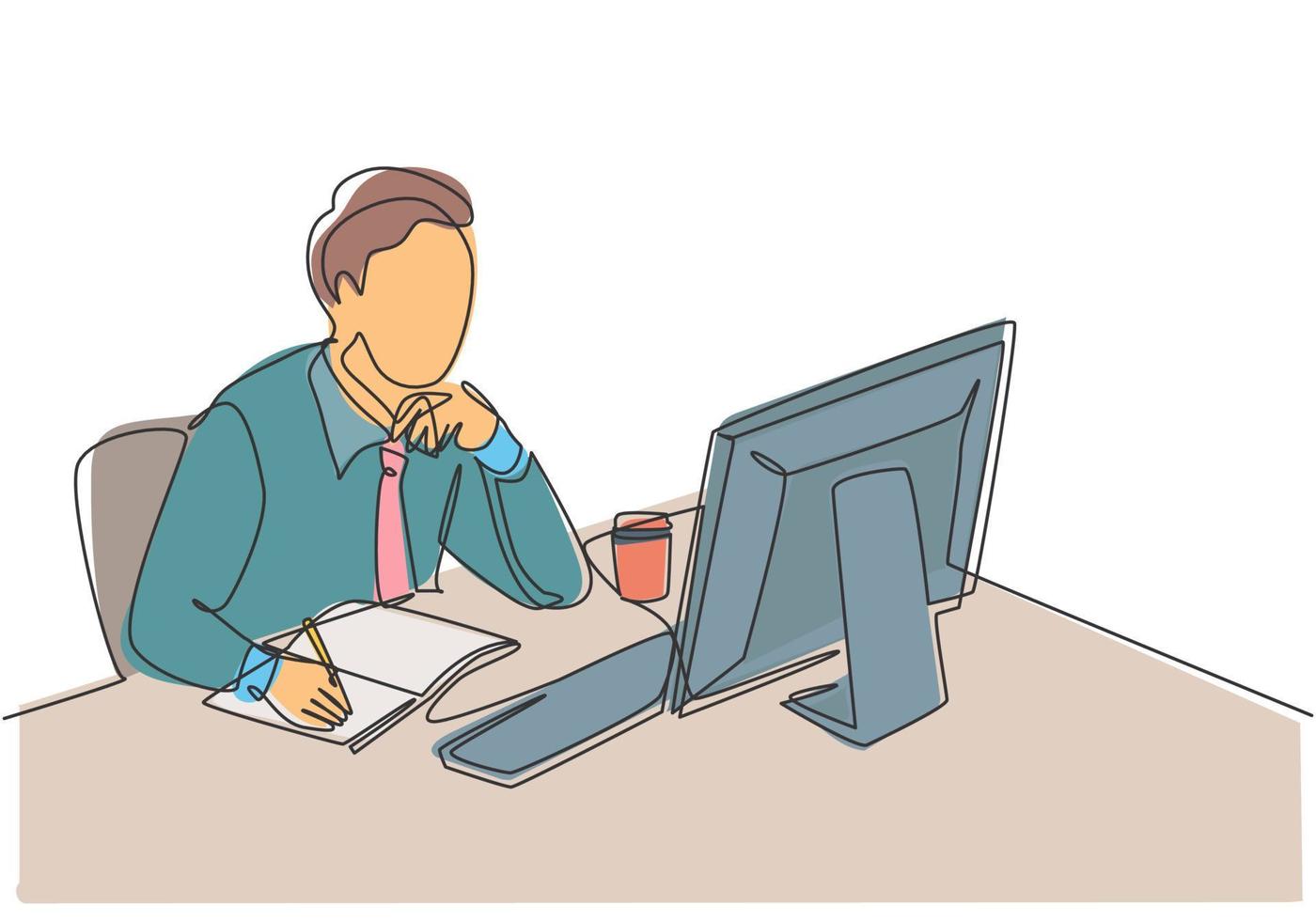 One single line drawing of young pensive businessman sitting and watching computer screen to analyze data company. Business analysis writing concept continuous line draw design vector illustration Pro Vector