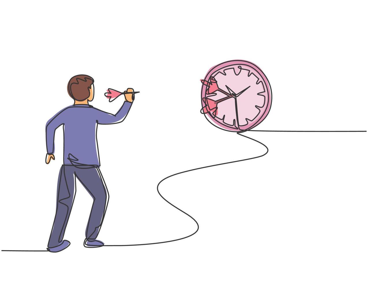 Single one line drawing of young business man hit the analog clock on wall with dart arrow. Business time discipline metaphor concept. Modern continuous line draw design graphic vector illustration Pro Vector