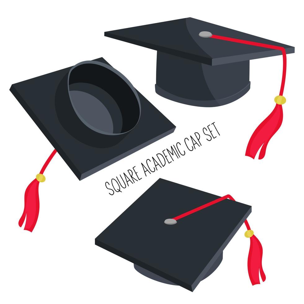 Collection of academic hats in different angles. High school or college graduation. Class 2023 in black and red. A set of graduation hats in different angles. Graduates of 2023. Pro Vector