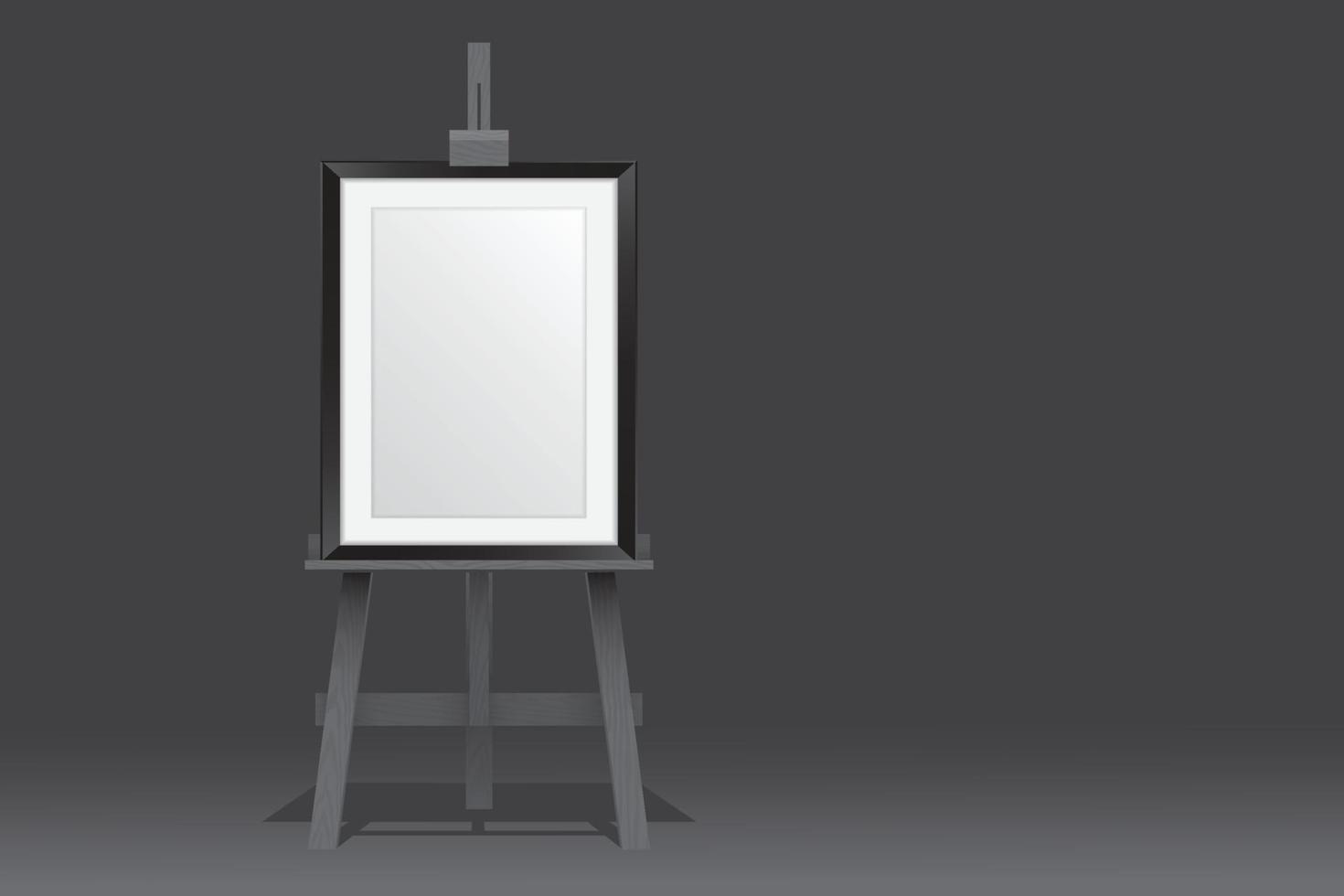 Wooden easel stands with picture frame on black background Pro Vector