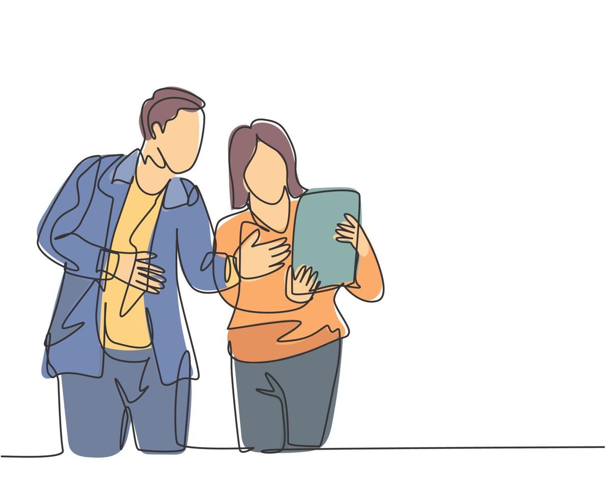 One continuous line drawing of young startup members check the work each others using laptop and tablet. Business process teamwork concept. Single line draw design vector illustration Pro Vector