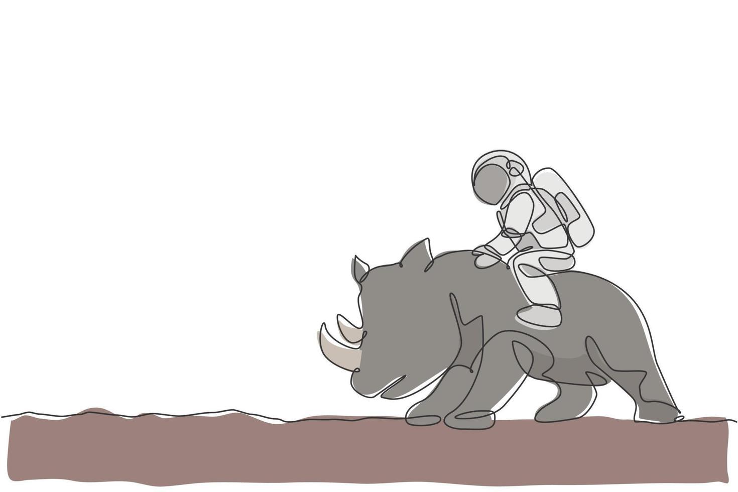 One continuous line drawing of spaceman take a walk riding a rhinoceros, wild animal in moon surface. Deep space safari journey concept. Dynamic single line draw graphic design vector illustration Pro Vector