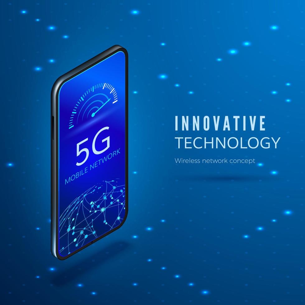 5G concept. Fifth generation mobile wireless network isometric banner. Smartphone with arrow moving to maximum on data transfer rate scale. Vector illustration Pro Vector