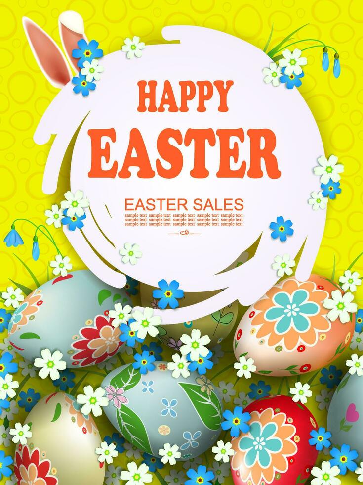 Yellow composition with an abstract round white frame, Easter eggs with a pattern and flowers. Pro Vector