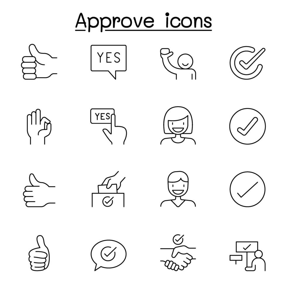Approve, check mark, assurance icon set in thin line style Pro Vector